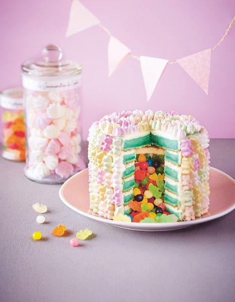 С виду торт-пиньята украшают как обычный торт, но когда вы режете торт, то из него начинают сыпаться разноцветные конфетки и драже. Поверьте, выглядит это очень эффектно.