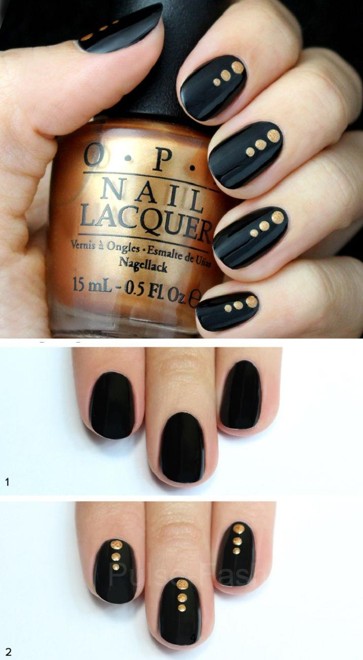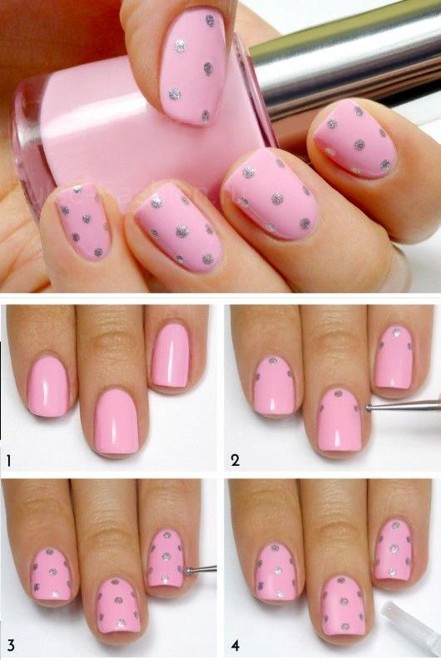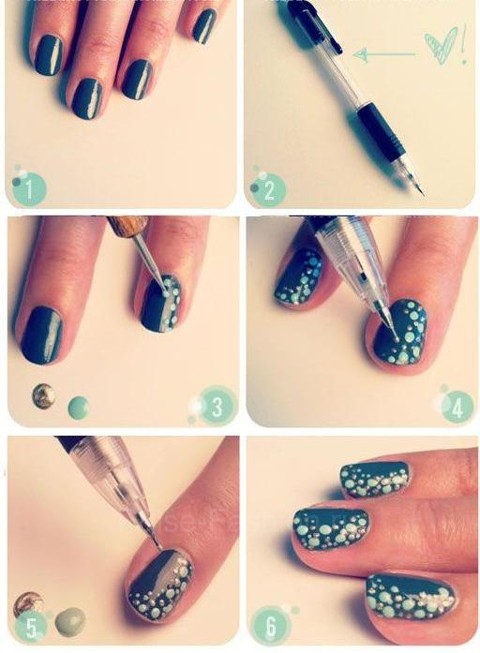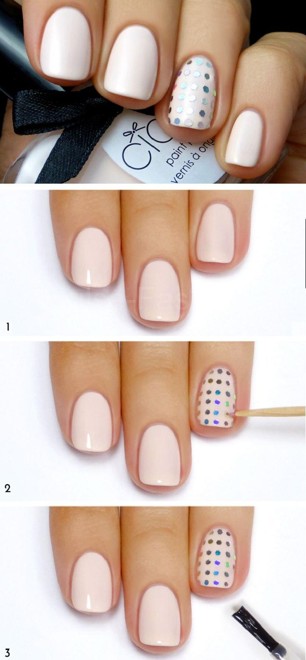 Как по мне, самый простой вариант маникюра-это маникюр в горох или в точку. Такой маникюр сделать проще простого. Всё, что вам нужно-это специальная кисточка с шариком на конце или же вы можете использовать обычную ручку. Вот наглядный пример.