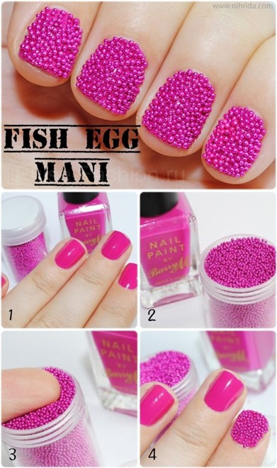 Так называемый икорный маникюр такжн сейчас очень популярен. Существуют специальный лаки, а также его можно сделать, используя специальные мелкие бусинки для маникюра. Все что нужно сделать-прокрасить ноготь и «обвалять» в бусинках.