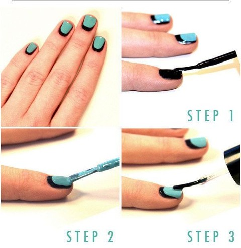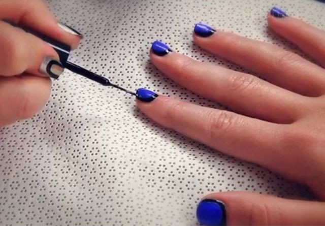 И второй вариант: покрасить ноготь одним цветом, а затем, с помощью тонкой кисточки обвести ноготь по краям.