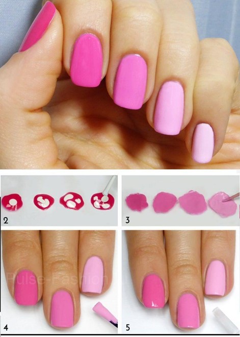 Есть два варианта градиентного маникюра. Первый и самый простой вариант-покраска каждого ногтя однотонным лаком с цветовой градацией от тёмного к светлому. Конечно же если у вас есть пять лаков разных оттенков одного цвета, то задача очень облегчается.