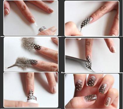 7.Ещё одна оригинальная идея для маникюра-это маникюр с использованием перьев. Если у вас имеются красивые перья, то смело используйте их для создания удивительного маникюра.