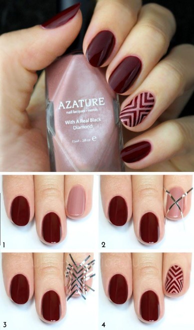 Вообще, изображать на ногтях различные геометрические фигуры, полосы всегда актуально. И кстати говоря, это не очень сложно. Для этого маникюра используйте специальные наклеики или же обычный скотч.