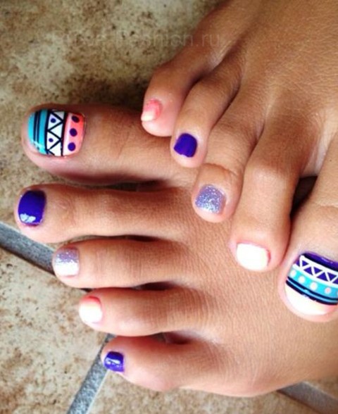 Вы можете сделать забавный педикюр в разнообразную полоску. Делается он очень просто из подручных средств. Вы можете использовать скотч, фольгу или придумаете что-то ещё. Делается такой педикюр также как и полосатый маникюр.