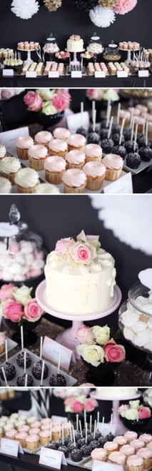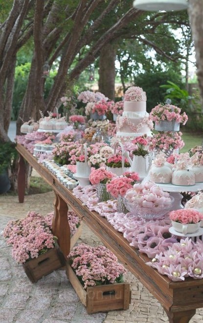 Но конечно же, самым красивым, оригинальным и помпезным должен быть десертный стол для свадьбы. Тут уж нужно приложить максимум усилий, чтобы сделать всё шикарно. Закажите шикарный многоярусный торт, кейк попсы, капкейки и много-много цветов и тогда вы получите прекрасный результат.