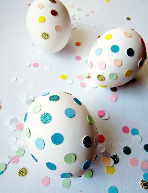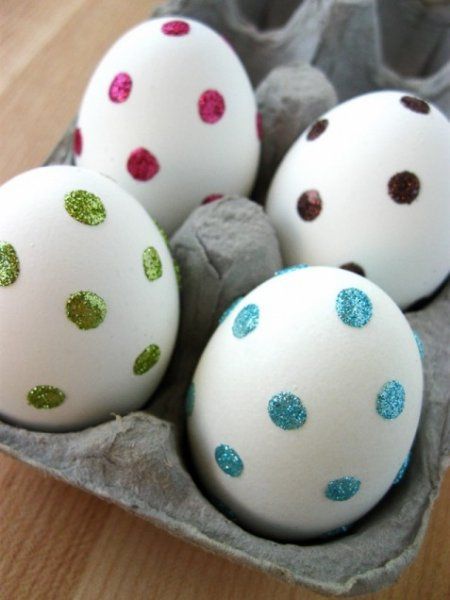 Ещё один способ с использование блёсток: клеем нарисуйте кружок на яйце и обмакните в блёстки.
