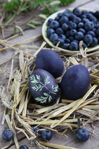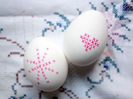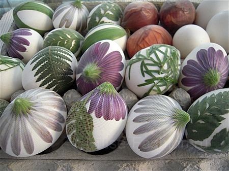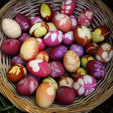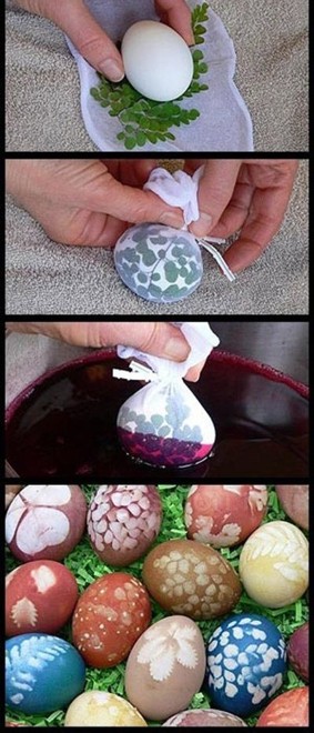 Наверное, все знают этот способ покраски яиц с использование листьев растений и чулков. Всё что нужно сделать — приложить лист плотно к яицу, а затем плотно обмотать чулком и зафиксировать. Затем обмакнуть яйцо в краситель, дать немного высохнуть и убрать всё лишнее.