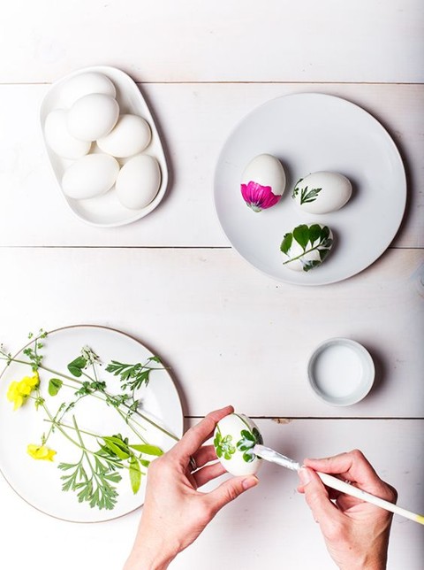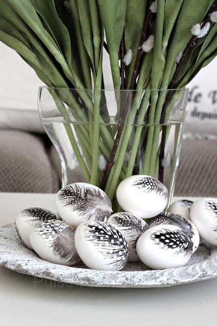 По принципу декупажа на яйца можно клеить что угодно. Так, к примеру, это могут быть перья или живые растения.