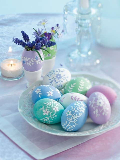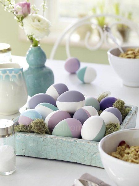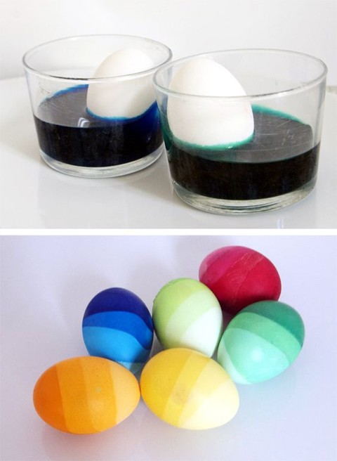 Очень просто, с помощью обычных пищевых красителей для яиц можно сделать прекрасные оригинальные яйца. Сделать это очень просто. Окуните яйца в краситель не полностью, а только часть. Можно окрасить яйца в один или несколько цветов, окуная яйца в краситель, но под разным углом. Результат превзойдёт ваши ожидания.