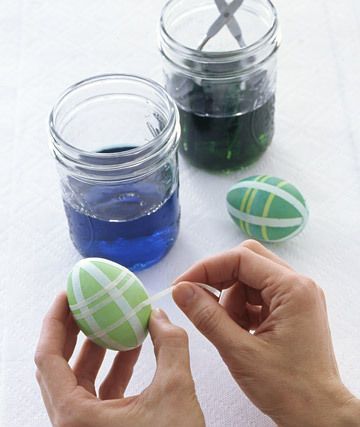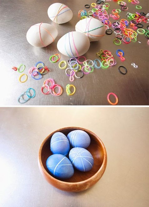 Если вам наскучили однообразные цветные яйца, но в то же время у вас мало времени, чтобы «придумывать велосипед». Предлагаем вам простое решение. Наверное у всех дома есть скотч, резинки, обрезки кружева и т.п. Из этих простых вещей также можно сделать что-то оригинальное. Просто обмотайте яйцо резинками или облепите полосками скотча в произвольном порядке. И окуните в краситель. Дайте немного просохнуть. Уберите всё лишнее и вуаля...