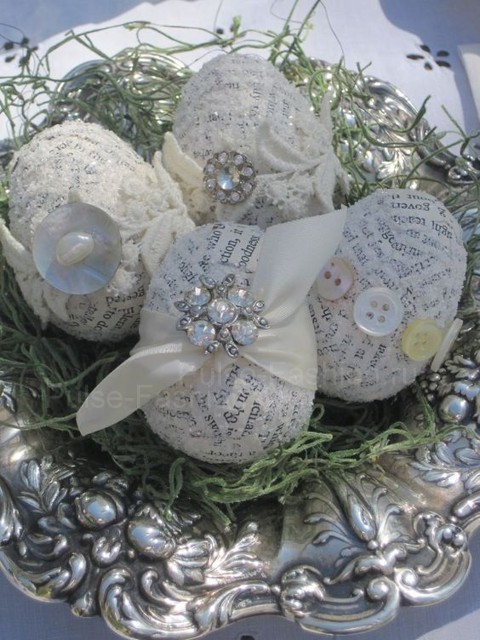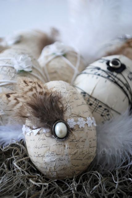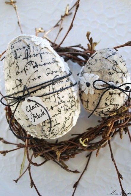 Также оригинальные винтажные яйца в технике декупаж можно сделать из старых газет, нот, старинных писем и т.п. Такие вырезки можно найти в интернете и распечатать. Лучше печатать на тонкой бумаге. Затем нарежьте листы небольшими полосками и приклейте бумагу таким же способом, как описано выше.