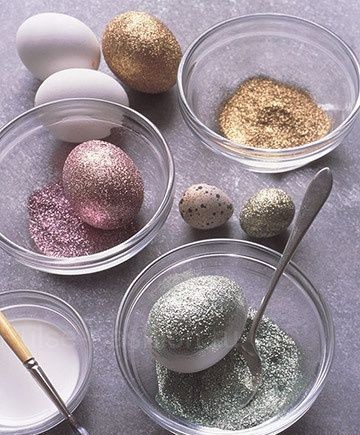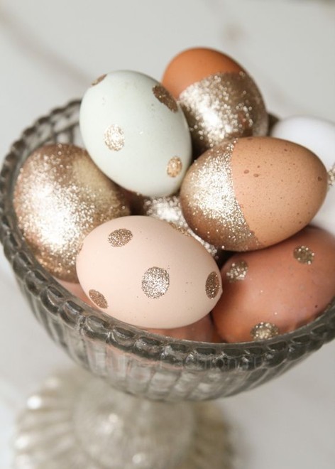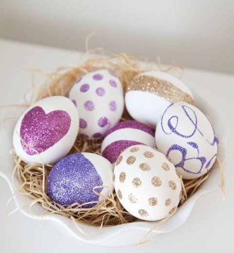 Если бы любите блёстки, то можно покрыть яйцо клеем и полностью обвалять яйца в блёстках.