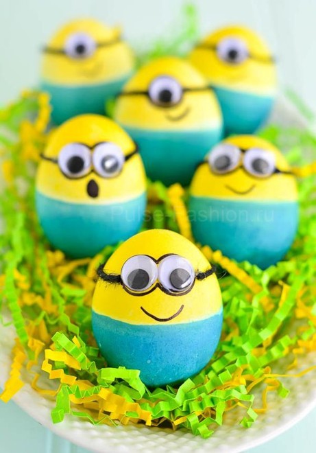Очень популярны сейчас яйца в виде миньонов. Сделать их очень просто. Окупите половину яйца в жёлтый краситель, а вторую половину покрасьте голубым красителем. Затем, с помощью маркера, дорисуйте или приклейте готовые глаза, и добавьте прочие нужные детали.