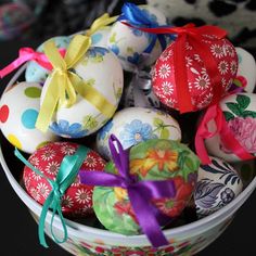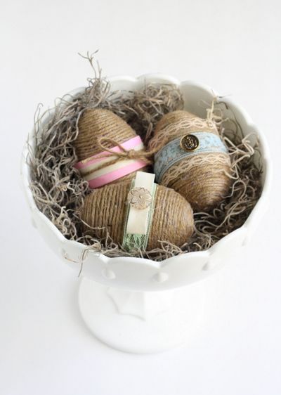 Ещё один простой и оригинальный способ декора пасхальных яиц -просто обмотать их нитками. Покройте яйцо клеем ПВА и плотно обмотайте цветной или джутовой ниткой.