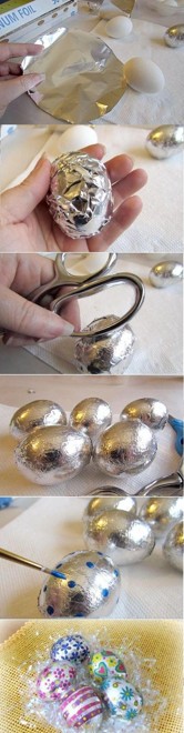 Оберните полностью яйцо кусочком фольги и разровняйте. Дополните можно нанести любые рисунки.
