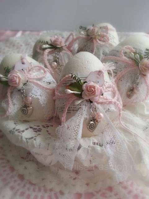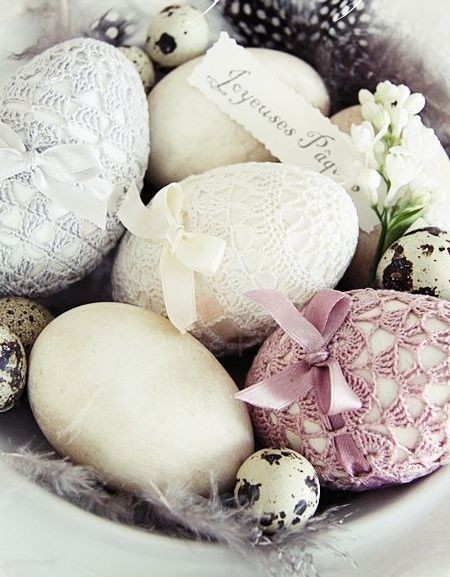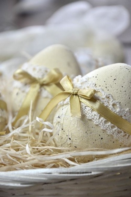 Многие считают, что на покраске яиц всё заканчивается. Но не стоит забывать о дополнительном декоре. Это могут быть бантики из атласной ленты либо из ниток, можно также использовать различные кружева, цветы, стразы, перья и всё, что только сможете придумать.