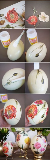 Если вы делаете сувенирные яйца, то для декупажа лучше использовать клей ПВА. Обмажьте яоуо клеем, затем приклейте вырезанные узоры или полностью кусочек салфетки на яйцо. Сверху снова покройте узор слоем клея.