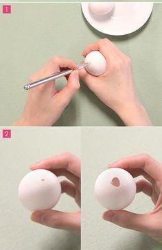 Прежде, чем я начну делиться с вами идеями декора, расскажу одну маленькую деталь. Есть два варианта праздничных яиц — вареные яйца, которые вы планируете съесть, а второй вариант — это сувенирные яйца, которые можно оставить на память или преподнести в подарок. Так вот, если вы планируете делать сувенирные яйца, то перед непосредственным украшением их нужно выдуть, чтобы в будущем они не испортились и не протухли. Сделать это очень просто. Сделайте в яйце два небольших отверстия снизу и сверху и просто выдуйте содержимое в мисочку.