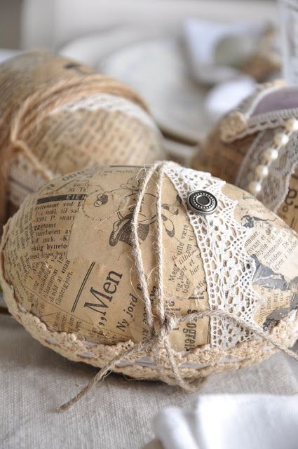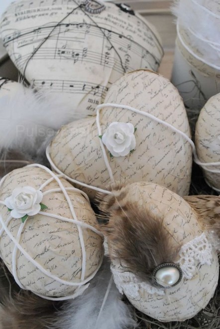 Также оригинальные винтажные яйца в технике декупаж можно сделать из старых газет, нот, старинных писем и т.п. Такие вырезки можно найти в интернете и распечатать. Лучше печатать на тонкой бумаге. Затем нарежьте листы небольшими полосками и приклейте бумагу таким же способом, как описано выше.