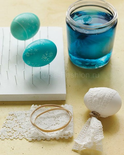 Если вам наскучили однообразные цветные яйца, но в то же время у вас мало времени, чтобы «придумывать велосипед». Предлагаем вам простое решение. Наверное у всех дома есть скотч, резинки, обрезки кружева и т.п. Из этих простых вещей также можно сделать что-то оригинальное. Просто обмотайте яйцо резинками или облепите полосками скотча в произвольном порядке. И окуните в краситель. Дайте немного просохнуть. Уберите всё лишнее и вуаля...