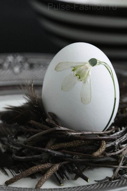 По принципу декупажа на яйца можно клеить что угодно. Так, к примеру, это могут быть перья или живые растения.