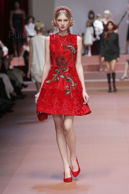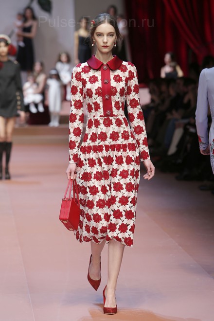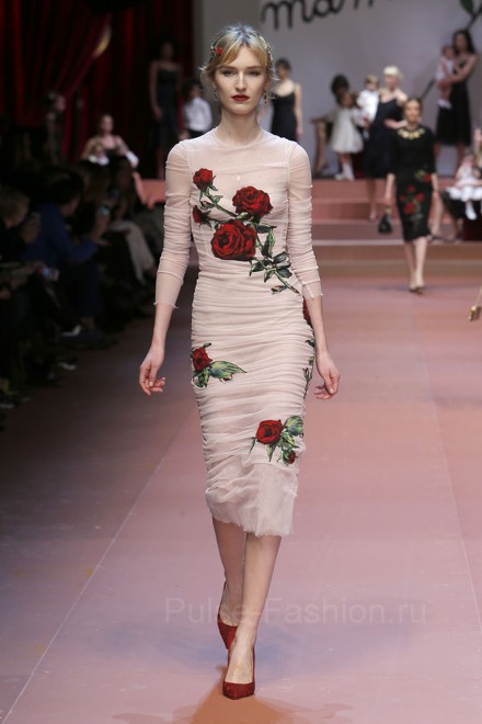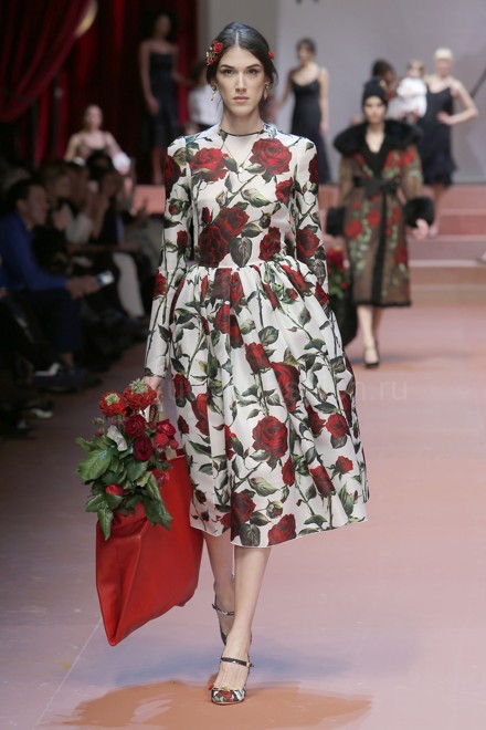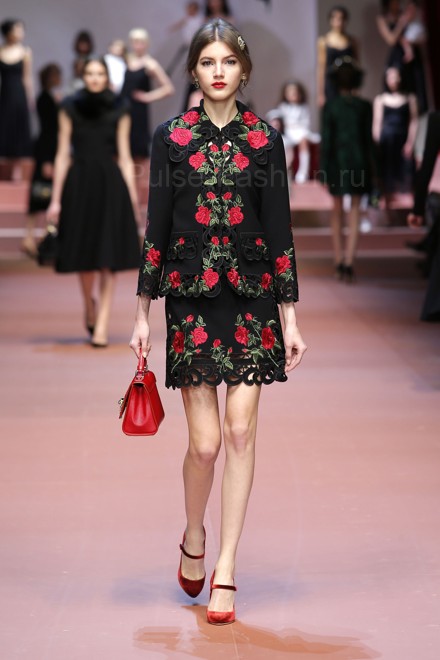 Чёрные наряды в коллекции D&G разбавляют огромные яркие красные цветы.