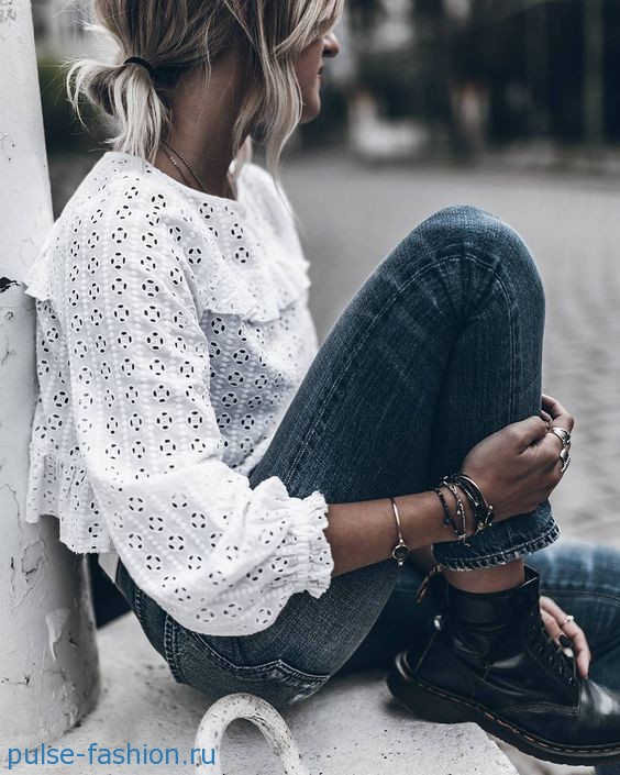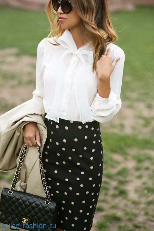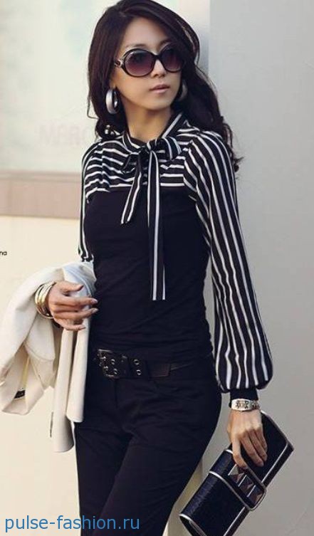 Размер банта значения не имеет: он может быть средним или огромным. Важно лишь, чтобы цвет блузы подходил к вашему цветотипу. Не так важна и форма банта, главное — правильно сочетать блузу с другой одеждой. Если банты ассоциируются у вас с образом «хорошей девочки», то попробуйте сочетать такие романтичные блузы с контрастной по стилю одеждой. Например, дополните лук джинсами, шортами, кюлотами или укороченными брюками и грубыми ботинками на низком ходу. Как вам такой образ? Получится очень современно, но при этом женственно и элегантно.