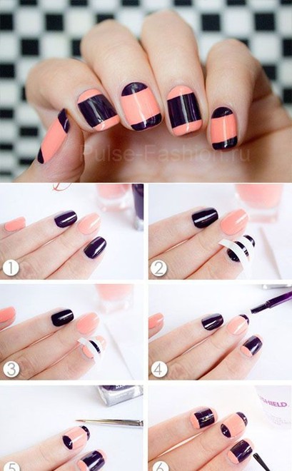 — цветной френч- покрытие кончиков ногтей цветным лаком. Также можно покрывать ноготь полностью одним лаком, а кончик выделять лаком другого оттенка или цвета.
