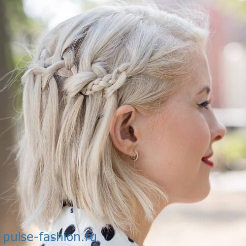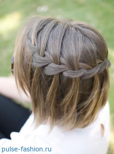 Очень распространённой причёской из кос для коротких волос является водопад. Смотрится такая причёска очень эффектно и она очень не сложная в исполнении.