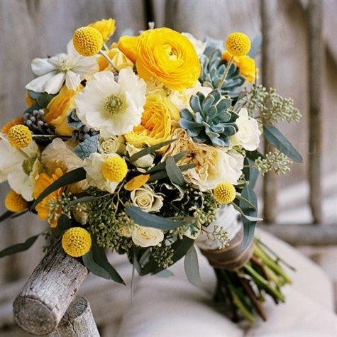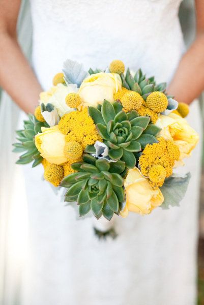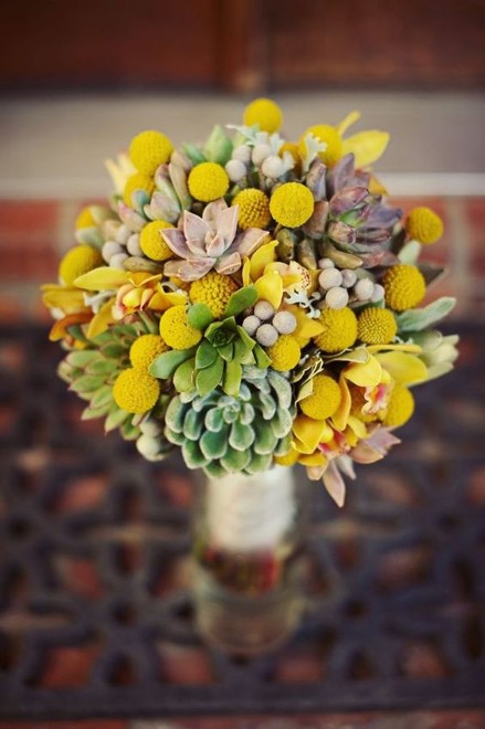 И конечно же суккуленты отлично сочетаются с другими цветами. Ими можно дополнять и украшать букеты из роз, пионов, маков, ранункулюсов, калл, подсолнухов и ещё многих других. Очень часто суккулетны комбинируют с краспедией-цветок, представляющий собой круглые жёлтые шарики.