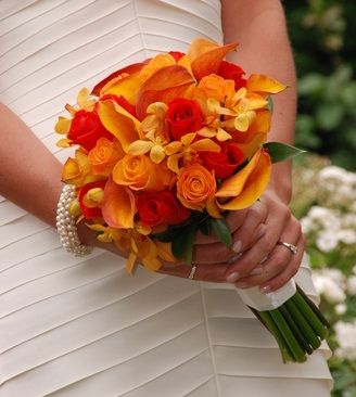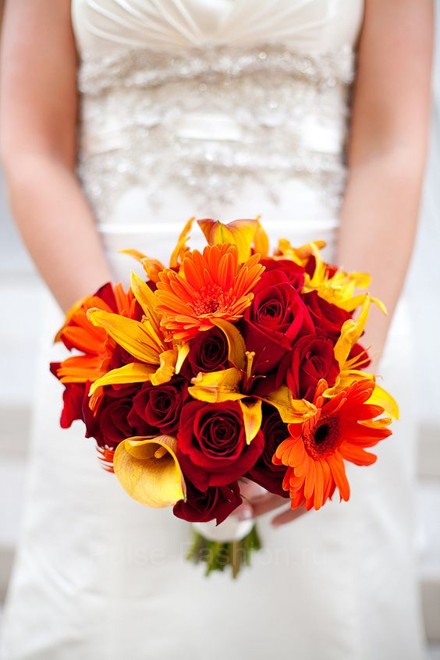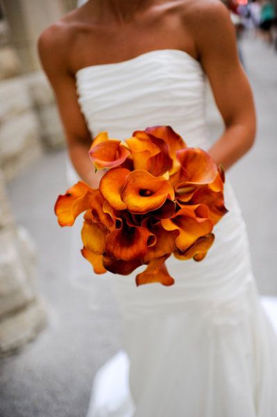 Каллы-идеальный вариант для осенней свадьбы. Когда листья деревьев становятся золотыми, как нельзя кстати станет букет из оранжевых калл.