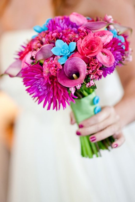 Очень эффектно и необычно будет выглядеть букет из разноцветных калл-фиолетовых, сиреневых, оранжевых или жёлтых.