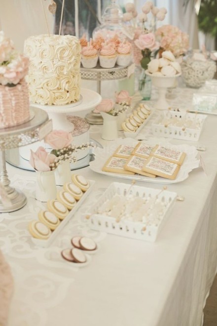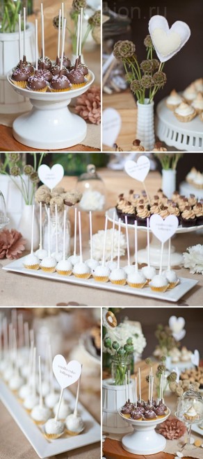Но конечно же, самым красивым, оригинальным и помпезным должен быть десертный стол для свадьбы. Тут уж нужно приложить максимум усилий, чтобы сделать всё шикарно. Закажите шикарный многоярусный торт, кейк попсы, капкейки и много-много цветов и тогда вы получите прекрасный результат.